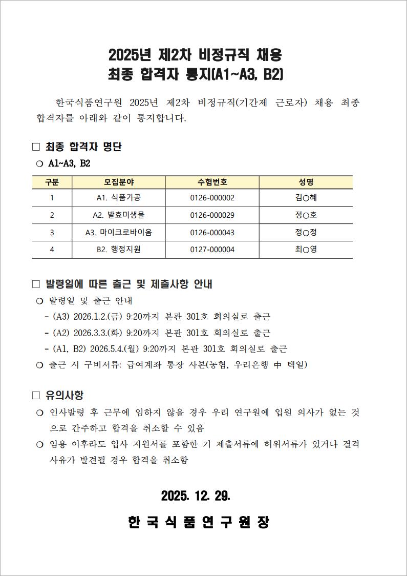 2025년 제2차 비정규직 채용 A1~A3, B2 분야 최종 합격자를 알려드립니다.